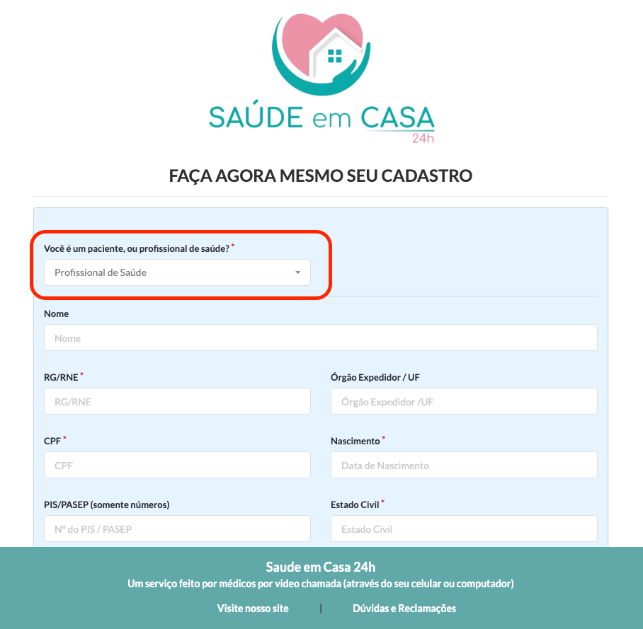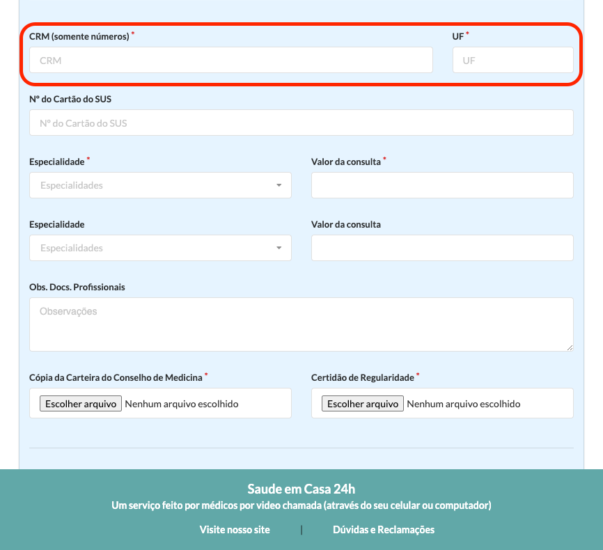 Lembre-se: informe seu CRM e local de emissão verdadeiros, essas informações serão checadas antes de ser liberado seu acesso ao sistema como profissional da saúde!