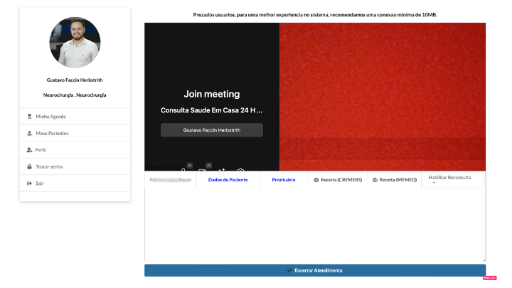 Realize a sua teleconsulta, registre as informações na caixa de texto e ao finalizar o atendimento clique no botão “Encerrar Atendimento” e encerre o atendimento (a evolução da consulta deve ser realizada antes da finalização do atendimento, sugerimos ao se despedir do paciente e orientar as condutas que se despeça e desabilite sua câmera e microfone para que possa realizar calmamente a evolução do caso)